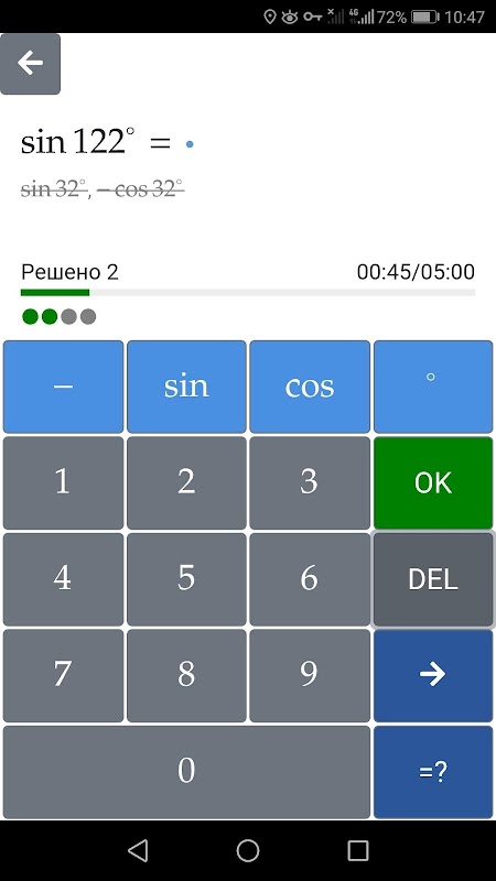 Aplicación: simulador de funciones trigonométricas reductoras seno, coseno, tangente, cotangente. Diseñado para entrenar secciones de trigonometría "Fórmula para moldear" y "Llevar a un ángulo agudo".