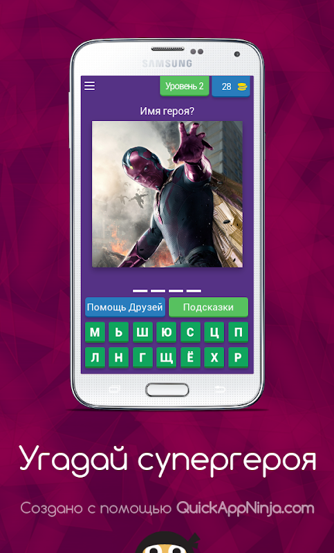 Увлекательное приложение Угадай супергероя - отличный способ провести свободную минуту в любом месте: в транспорте, в очереди или сидя за столиком в кафе. Игра построена по принципу шоу Поле Чудес и подразумевает отгадывание слов - имён известных писателей. К услугам пользователя подсказки, кнопка Помощь Друзей и деньги, используя которые можно показать одну из букв или перейти на следующий уровень.