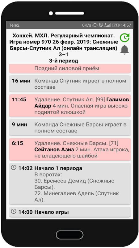 Cuando haces clic en el juego deseado, se abrirá una transmisión de texto de hockey en la que los eventos del partido se muestran en tiempo real con actualización automática. Las metas se destacan en verde, multas, en rojo para la percepción visual de puntos importantes en el campeonato de hockey.