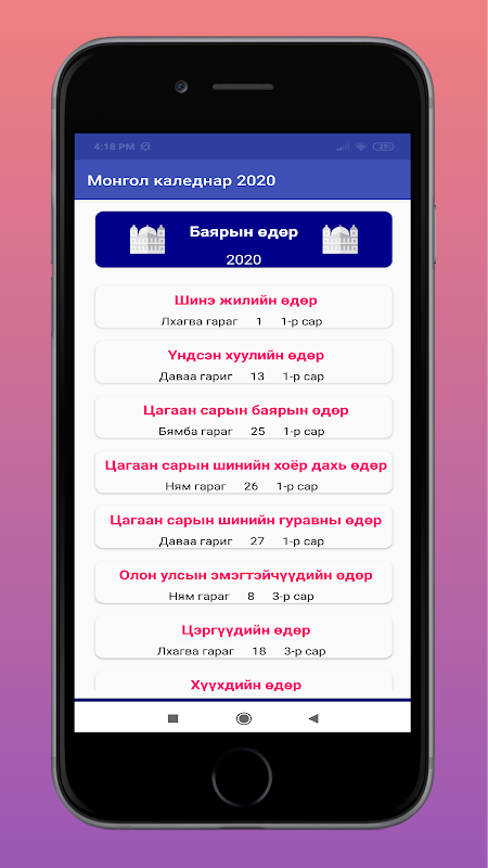 2020 оны хуанли: Энэхүү програм нь 2020 оны нийтийн амралт, баяр наадмыг багтаадаг. Та баяр наадам болон баяр ёслолоо төлөвлөхдөө энэ програмыг ашиглаж болно.
