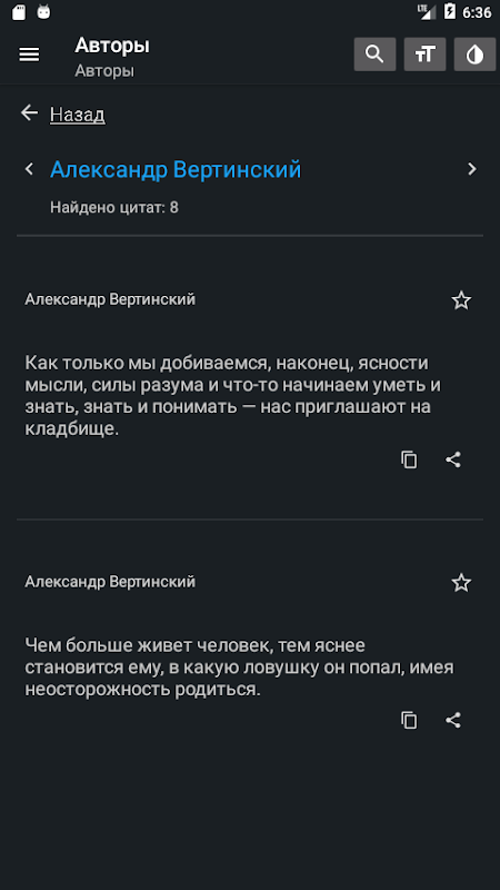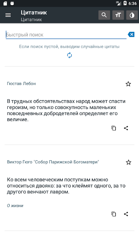 Con la ayuda de una interfaz fácil de usar y una búsqueda, puede encontrar fácilmente el autor o el tema que le interesa. Y las citas que te gusten se pueden guardar en favoritos. Puede compartir las citas que encuentre con sus amigos.
