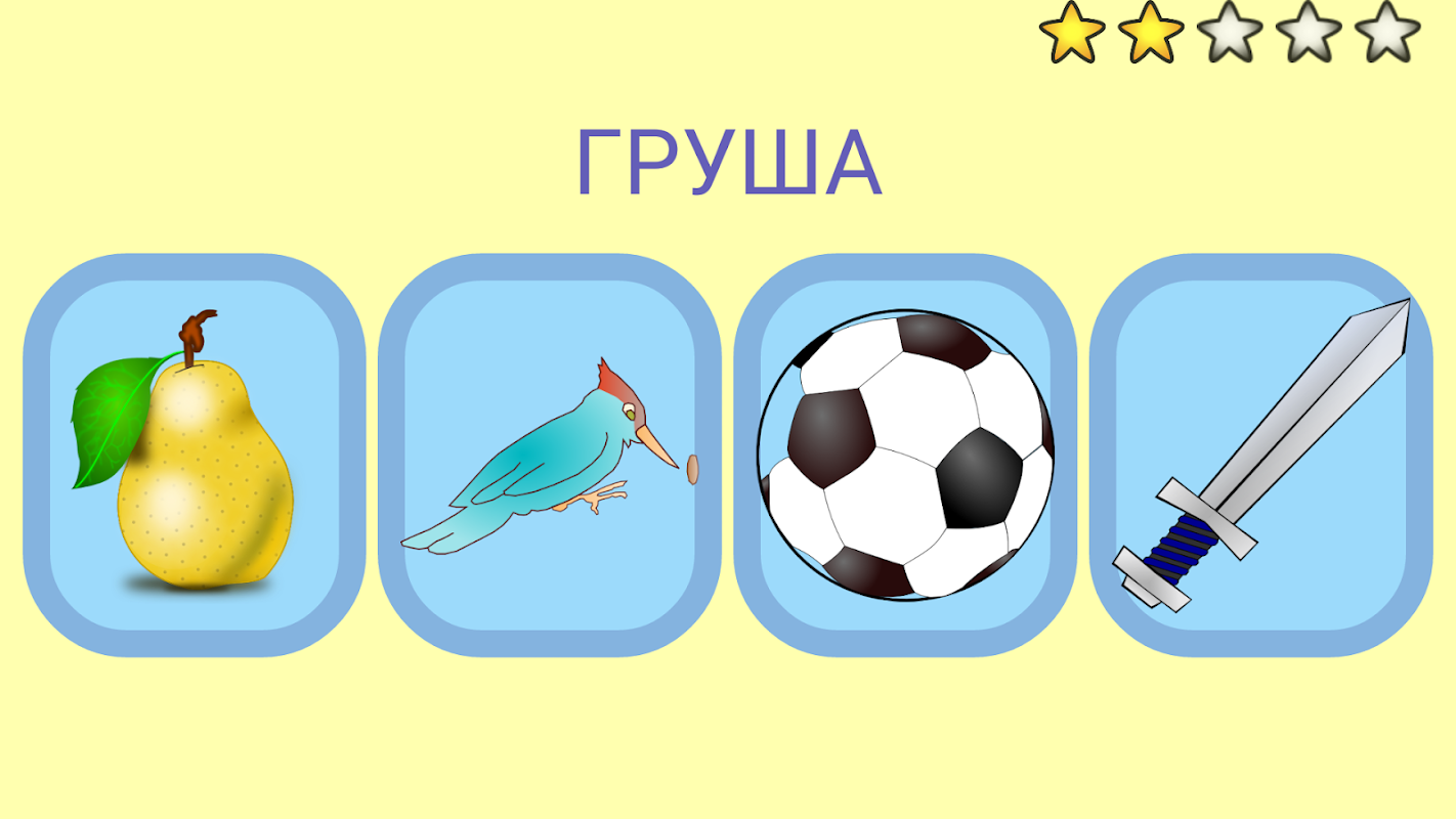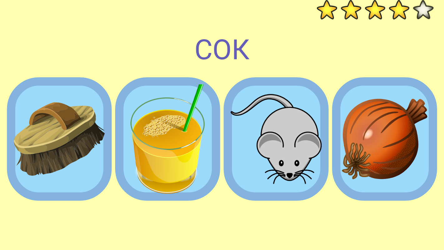 - по заданному слову необходимо выбрать правильную картинку. Режим называется "4 картинки".