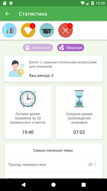 ● Sección con errores cometidos al aprobar el examen de la policía de tránsito (dividida en temas, muestra el porcentaje de errores sobre el tema)