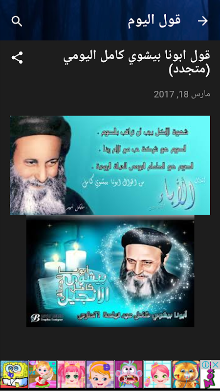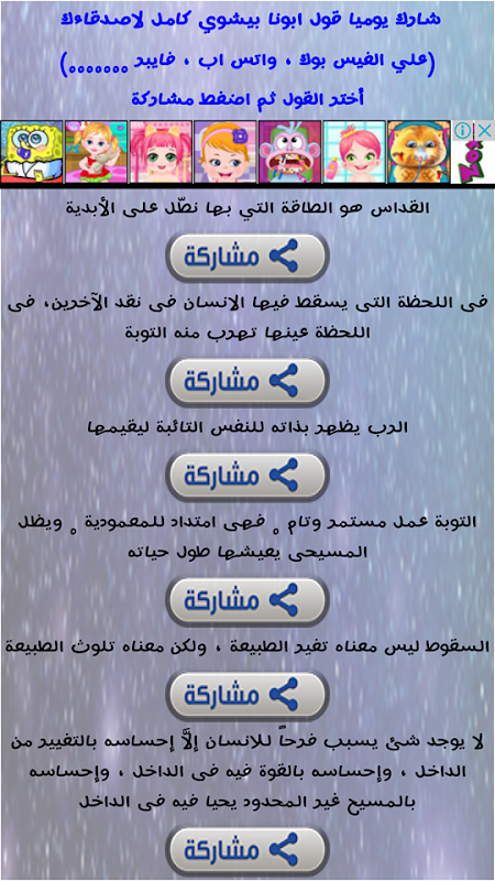 6- شاركنا الخدمة وهي صفحة بها مجموعة مختارة من اقول ابونا بيشوي كامل وتحت كل قول زر "مشاركة" يمكنك من اختيار القول ومشاركته لاصدقاءك علي الفيس بوك - واتس اب - فايبر - ..... الخ