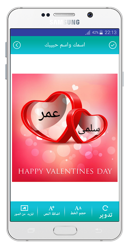 لن تبحث بعد الان عن تطبيقات اخرى لكتابة اسمك او ايمك واسم حبيبك على تشكيلة رائعة من الصور التي تناسب كل المناسبات , و يمكنك الكتابة على الصور باللغة التي تريد و التحكم في حجم الخط واللون و كذلك كتابة نص مرافق لاسمك و اسم حبيبك , و يمكنك كذلك استعمال الصور المنشأة في صور الحساب و مشاركتها مع اصذقائك و يوفر التطبيق مميزات رائعة سوف تعجبكم بالتأكيد