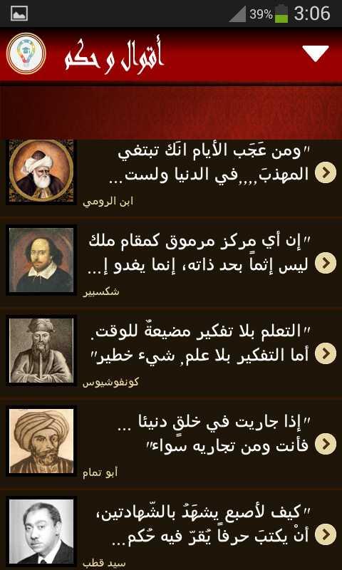 يحتوي هذا التطبيق على مئات اقوال و حكم لعظماء التاريخ كالامام علي بن ابي طالب و اينشتاين و غاندي و عمر بن الخطاب و صدام حسين و الحسن الثاني و المتنبي و غيرهم