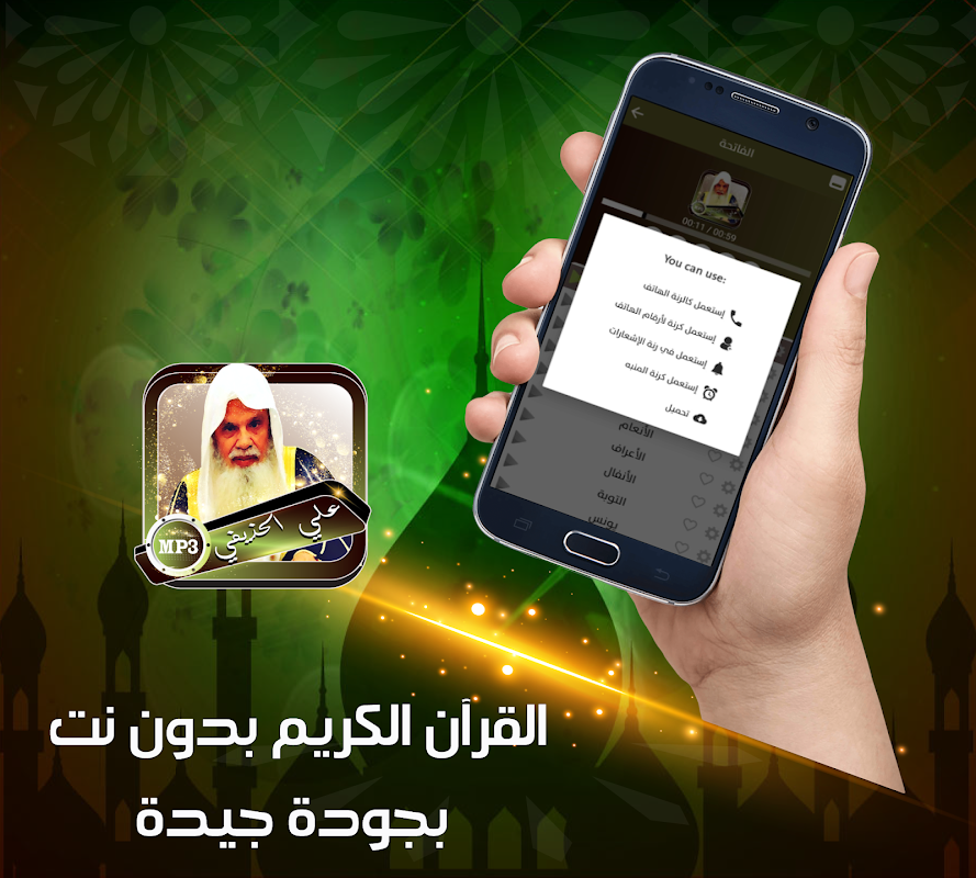 كما يمكنك اختيار السور وحفظها في قائمتك المفضلة كذلك يمكنك استعمالها كرنة للهاتف و للاشعارات وايضا كرنة المنبه وادا اردت يكمنك ايضا تحميلها.