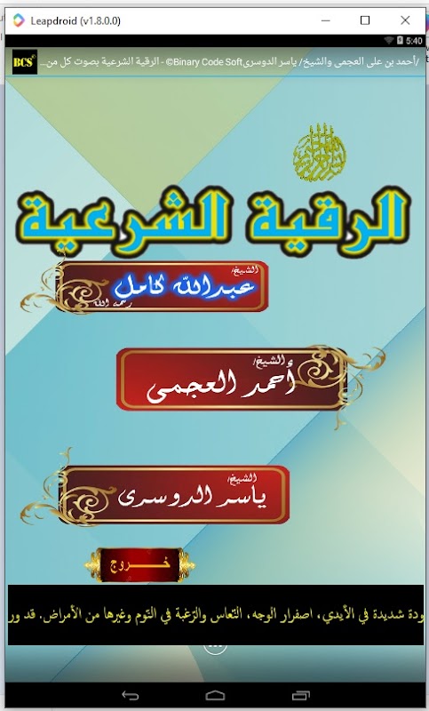 La aplicación es una ruqyah legal del Libro de Dios y la Sunnah del Elegido, que Dios lo bendiga y le conceda paz, en la voz del Jeque Abdullah Kamel, que Dios tenga misericordia de él - Jeque Ahmed Al-Ajmi - Jeque Yasser Al-Dosari.