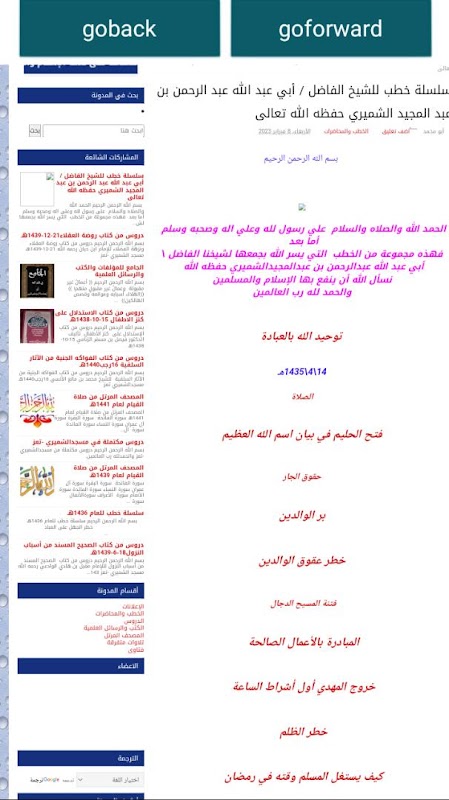 En el Nombre de Dios, el Compasivo, el Compasivo, Alabado sea Dios, Señor de los Mundos, y doy testimonio de que no hay más dios que Dios, y que Muhammad es Su Siervo y Mensajero, que la paz y las oraciones de Dios sean con En cuanto a lo que sigue: Esta es una colección de sermones del virtuoso Jeque: Abd al-Rahman al-Shamiri, que pronunció en la Mezquita al-Shamiri en Taiz, en la que permaneció desde su partida de Dammaj en 1435 AH Que Dios le facilite, alabanza y gracia, al buen chico, Muhammad bin nuestro hermano, escribir estos discursos para el año 1435 d. H., y está decidido, si Dios quiere, a escribir los discursos restantes para el resto de los años. que no estaban terminados.