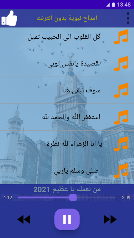 أدخِل ملاحظات اتطبيق امداح نبوية بدون انترنت يقدم لك مجموعة من الأمداح النبوية المختارة بعناية لتستمع إليها في أي وقت ومن دون الحاجة إلى الاتصال بالإنترنت.