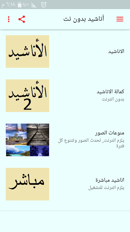 Las canciones de Meshary Al-Afasy, las canciones de Maher Zain, las canciones de Hammoud Al-Dar, las canciones de Fadel Shaker, las canciones de Abdul Majeed Al-Fawzan, las canciones de Rami Muhammad, las canciones de Sami Youssef, las canciones de Ahmed Abu Khater y varias canciones islámicas