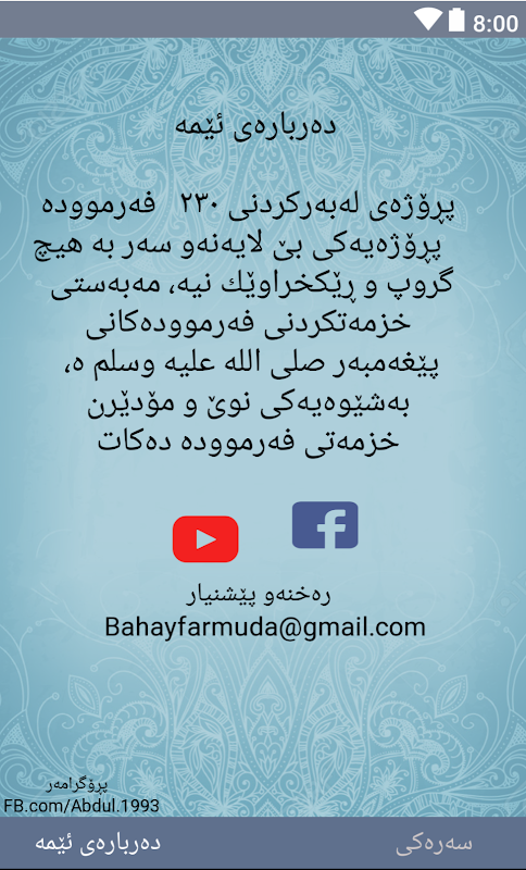 ئەم ئەپڵیکەیشنەی ئێستا لەبەردەستتانە یەکێکە لە بەرهەمەکانی پڕۆژە کە پێکهاتوە لە 230 فەرموودەی پێغەمەری خۆشەویست ﷺ بەمانای کوردیەوە, لەگەڵ ئەمەشدا فەرموودەکان و ماناکانیان بەدەنگێکی خۆش تۆمارکراون, بەپێی نێوەڕۆک و مانای فەرموودەکان دابەشکراون بەسەر کۆمەڵێک ناوونیشان.