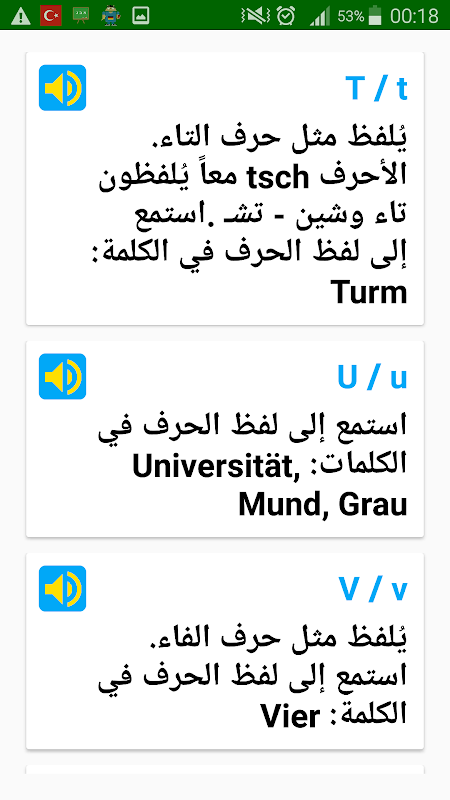 La aplicación contiene las palabras y oraciones más importantes del idioma alemán traducidas al árabe con la forma en que se pronuncia el sonido y la imagen.