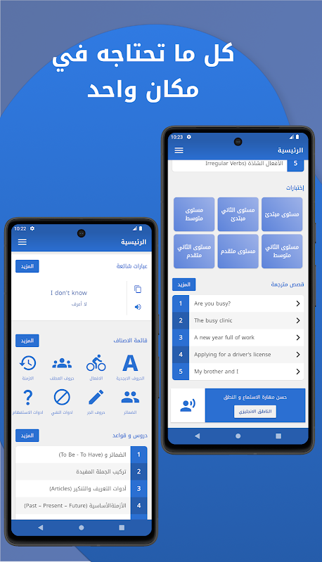 Simply English es una aplicación que te permite aprender inglés de la forma más sencilla. Contiene las palabras y frases más usadas en inglés, junto con ejemplos útiles para una mejor comprensión. También incluye varias secciones, cada una con numerosas palabras y ejemplos para una fácil comprensión. Una sección incluye una amplia colección de las frases más usadas en inglés traducidas al árabe. La aplicación incluye una sección para hablantes de inglés que convierte todo lo que escribes en inglés en audio para aprender a escuchar y pronunciar. Otra función que hemos añadido es la función de audio, que te permite hacer clic en cualquier palabra o frase y escuchar cómo se pronuncia para aprender inglés. La aplicación incluye lecciones básicas de inglés, historias traducidas y exámenes cortos con correcciones.