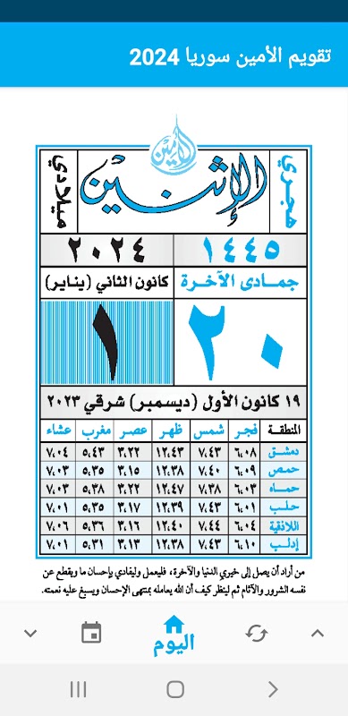 (Este calendario es específico solo para ciudades sirias. Para descargar la aplicación que contiene tiempos de oración en el mundo, puede descargar la aplicación “Calendario Al-Amin - 2024, o Calendario Al-Amin - Tiempos de oración y Adhan”)