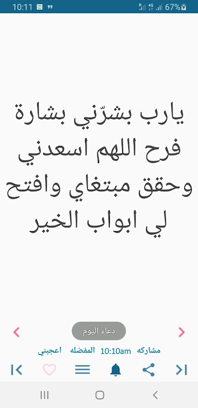 سيقوم التطبيق بارسال كل يوم دعاء جديد يمكن ضبط الدعاء كحاله او مشاركه الدعاء او حتى التغريد في تويتر به ا ونشره على الفيس بوك