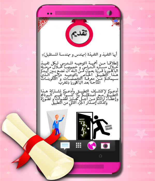 كل فرد مرا من مدرسة تم جامعة من أجل الحصول على شهادة و التكوين للحصول وظائف شركات و يعتبر tawjih التوجيه التربوي دعامة أساسية في تحسين جودة التعليم والتكوين و اختيار الطريق الصحيح من اجل تحقيق أفضل النتائج وإعطاء مجموعة من نصائح، دليل التوجيه الجامعي هو عملية جد هامة في المسار التعليمي والمهني لكل فرد بعد تمكن دروس البكالوريا، فكل تلميذ أو طالب إلا وبحاجة إلى conseiller en orientation إعلام جيد ودقيق و حلول للمناهج الدراسية واستشارة مصاحبة وتوجيه مؤطر بحيث إن هده الجوانب تؤثر بشكل مباشر أو غير مباشر على تحديد الاختيارات والأولويات بعد نهاية كل مرحلة دراسية عند كل طالب واستكمال دراسات عليا. من هده الأمور الأساسية في أهمية التوجيه الدراسي و توجيه الجامعي، قرر بحول من الله ان ننشئ تطبيق دليل التوجيه الجامعي 2017 يسهل و يوضح مجموعة من الامور الغامضة لدا الطلب حول التوجيه المدرسي حيت نتطرق في هدا التطبيق إلى مجموعة من التخصصات و وظائف المتاحة لحملي شهادة الباكلوريا و إلى توضيح وتصحيح المتمثلات حول الشعب والمهن وتطوير صورة الذات و البحث عن عمل أو تدريب.