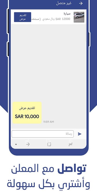 - مراسلة المعلن من نفس التطبيق وتقديم العروض للسيارة (دردشة او اتصال).