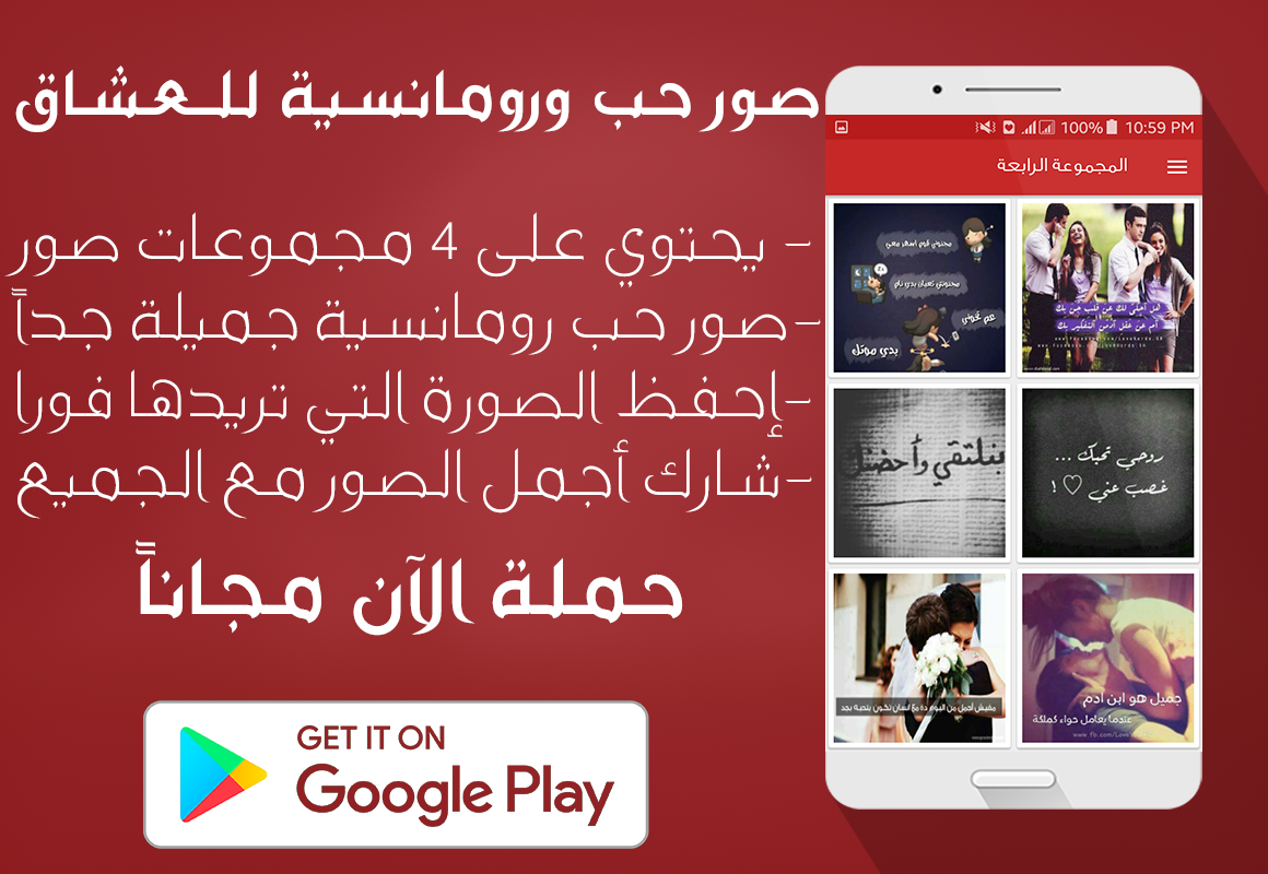 يتضمن هذا التطبيق على أروع صور الحب و الغرام و الرومانسية و رسائل حب مكتوب عليها عبارات حب و أشعار حزينة ,كذلك يمكنك مشاركتها مع حبيبك أو حبيبتك كحالات وات ساب و حالات فايسبوك أو وضعها كصور للفيس بوك، هذا التطبيق به مجموعة كبيرة من خواطر حب رومانسية و خواطر حزينة معبرة للحبيب أو الحبيب و كذا صور شعرية رومانسية و صور عتاب حزينة و رسائل حب رومانسية ، كما ستجد(ين) فيه صور عشق عليها كلمات رومانسية و و أخرى مكتوب عليها كلمات وعبارات عن الغرام و الفراق