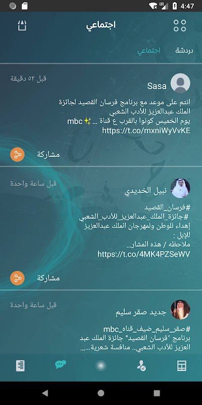 كن جزءً من برنامج المنافسة الشعرية والأدبية والتراثية أكبر مسابقة في العالم العربي (جائزة الملك عبدالعزيز للأدب الشعبي) شعراء وشاعرات العرب سيتحدّون على أربعة من الألقاب الكبرى في الشعر الشعبي النبطي، شعر المحاورة ، فن الشيلات ، والشعر الشعبي العربي
