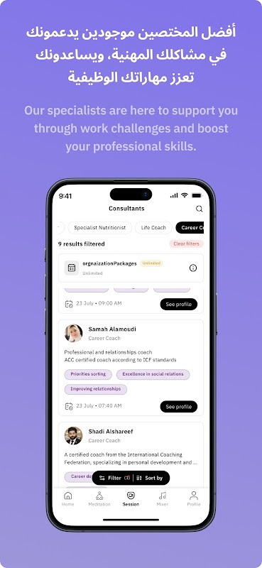 • Sesiones de asesoramiento individual: conéctese con psicólogos, asesores profesionales, asesores financieros, preparadores físicos y nutricionistas a través de sesiones de video, audio o texto, en árabe o inglés.