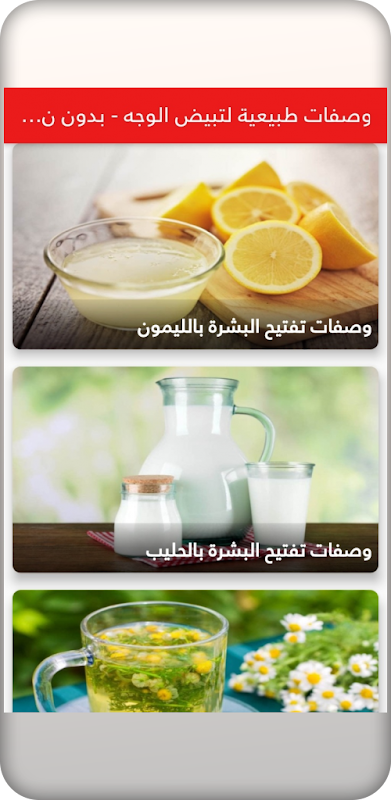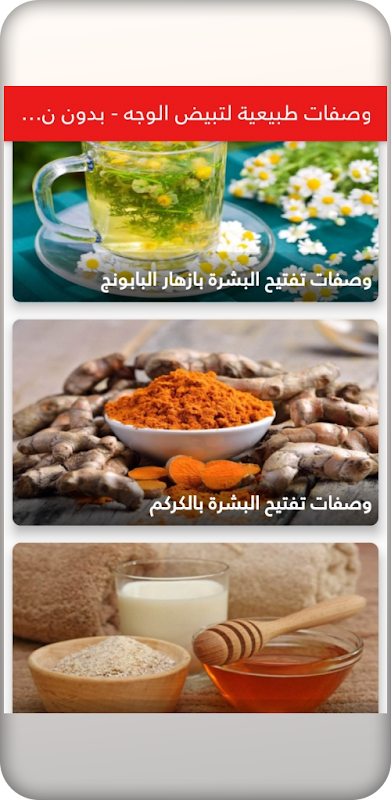 تطبيق وصفات طبيعية لتبيض الوجه يقدم لكم مجموعة من الوصفات الطبيعية لتبيض الوجه ويحتوي على التالي