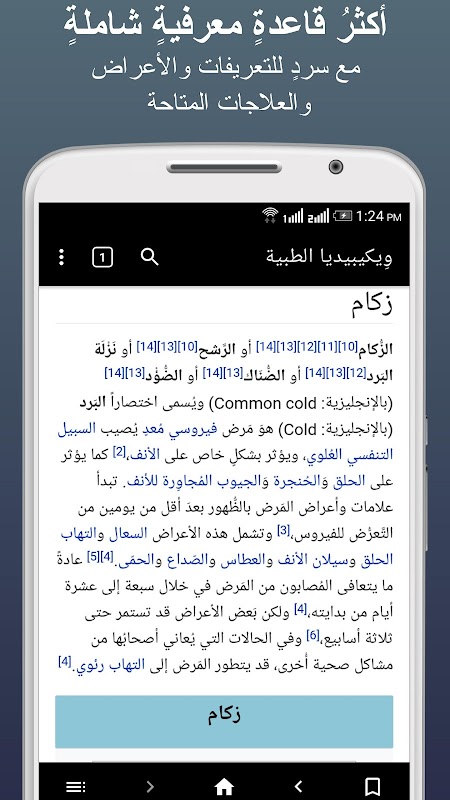 La aplicación médica Wikipedia contiene más de 20.000 artículos médicos, por lo que es la colección más grande y completa de artículos de salud disponible en árabe. Incluye contenido sobre enfermedades, medicamentos, anatomía y otros temas de salud disponibles en la popular enciclopedia Wikipedia gratuita.