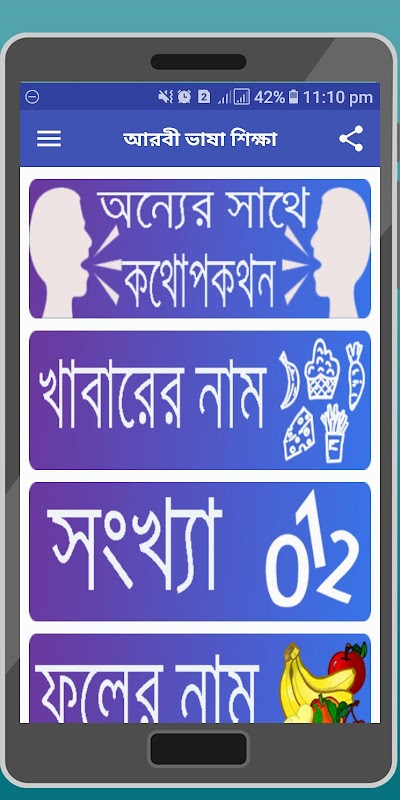 আরবী ভাষা বাংলাইয় শিখার জন্য আমাদের এই অ্যাপ টিতে যা যা রয়েছে তা কিছুটা নিচে দেয়া হলোঃ