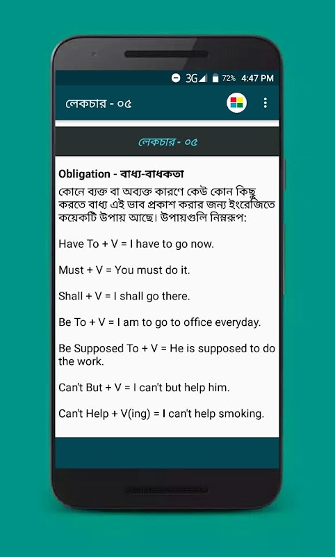 ভাষা হিসেবে ইংরেজির গুরুত্ব নতুন করে বলার কিছু নেই। তাইতো জীবনে অনেক চেষ্টা করেছেন ইংরেজিতে কথা বলতে। ভাষাটি শেখার জন্য অনেক ধরনের বই কিনেছেন, গ্রামার পড়েছেন। কিন্তু ইংরেজিতে অনর্গল করা বলতে পারেন নি। তাই আপনার জন্যই এই অ্যাপস ইংরেজিতে খুব ভাল ভাবে সারাজীবনের জন্য শিখতে চাইলে আমাদের এই অ্যাপটি অনুসরন করতে পারেন । আমাদের এই অ্যাপটি পড়ে খুব সহজেই ইংরেজি এর অনেক কিছু সম্পর্কে অভিজ্ঞ হবেন যা আপনাকে ইংরেজিতে কথা বলার উপযোগি করে তুলবে।