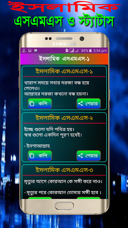 ইসলাম মানুষকে সঠিক পথ দেখায়। ইসলাম মানুষকে ন্যায়ের শিক্ষা দেয় এবং সঠিক পথের দিশা দেখায়। ইসলাম পরিচালিত হয় মহান আল্লাহ তায়ালার নাযিলকৃত পবিত্র কুরআন ও রাসূল স: এর হাদিস এর আলোকে। ইসলামে রয়েছে সুন্দর সুন্দর বাণী যা মানুষের জীবনকে পরিবর্তন করে দেয়। আমাদের অ্যাপ থেকে ইসলামিক এসএমএস ও স্ট্যাটাস গুলো পড়ে আপনার জীবনকে