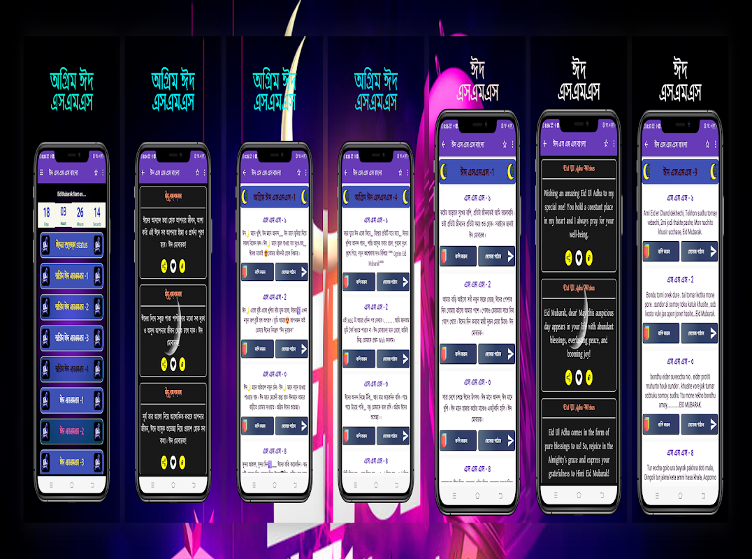 এই অ্যাপটিতে রয়েছে সেরা সকল বাছাইকৃত নতুন নতুন ঈদের এসএমএস। এবারের ঈদের এস এম এস অ্যাপটি চমৎকার সব ঈদের মেসেজ নিয়ে তৈরি করা হয়েছে যা একেবারেই নতুন।
