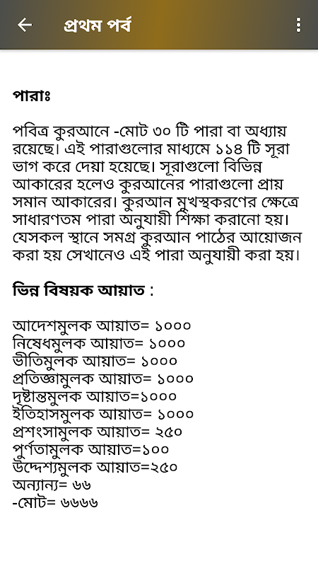 - কুরআনের পারা এবং আয়াত সংখ্যা এবং নাম।