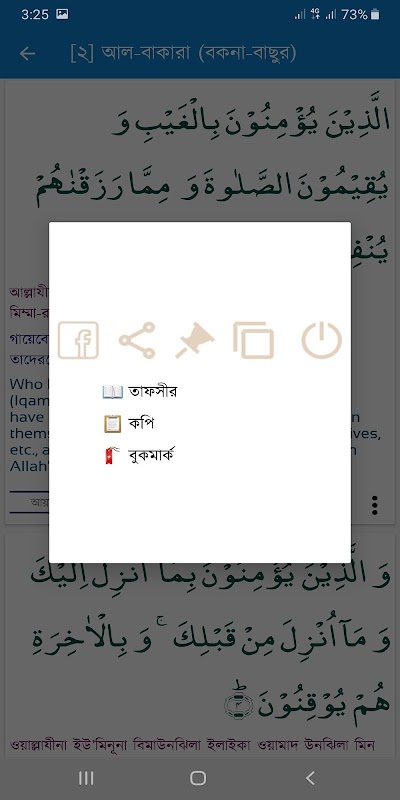 Se han añadido 5 tafsires y 4 traducciones al bengalí. Al hacer clic en cualquier versículo, tendrá la opción de ver el comentario. Tafsir se puede ver haciendo clic allí. Se puede seleccionar cualquier comentario del menú desplegable.