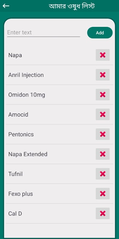 আমার ওষধ লিস্টঃ এখানে আপনি সহজে আপনার ওষধের ত ালিকা গুলো লিস্টে এ্যাড করে রাখতে পারেন ।এবং চা ইলে যেকোন ওষধ তালিকা থেকে বাদ ও দিতে পারেন ।