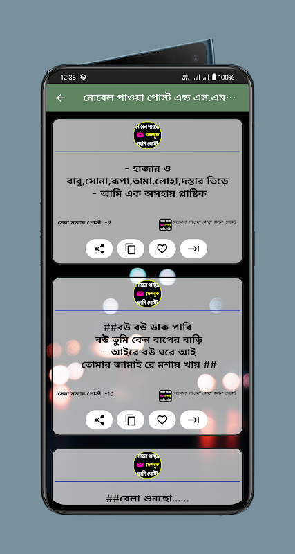 এই অ্যাপসটিতে যে সব মজার পোষ্ট আর ক্যাপশন আছে তা আপনি বন্দুদের সাথে ১ কিল্কে কপি এবং শেয়ার ক রতে পারবেন । প্রতিটি পোস্ট আর ক্যাপশন বাছাইকৃত ভাবে নেওয় া । আশা করি অ্যাপসটি আপনাদের অনেক ভালো লাগবে।