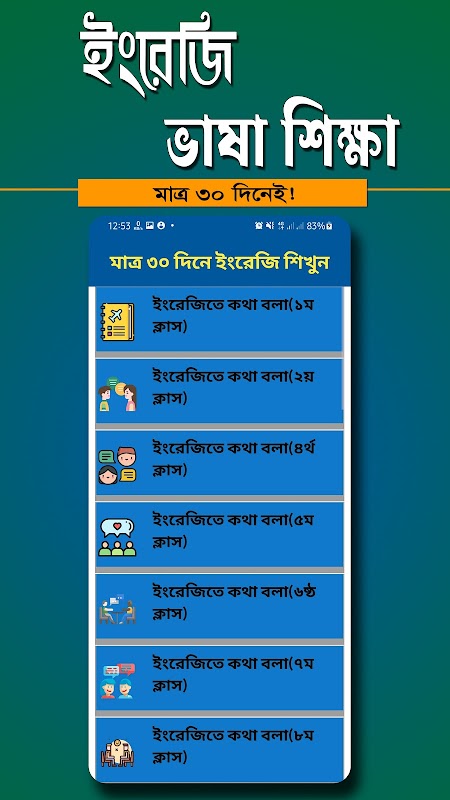 Aplicar estrategias de aprendizaje del inglés. No hay escasez de libros para aprender inglés en el mercado, pero encontrar un buen libro para aprender inglés hablado es muy difícil. En esta aplicación incluimos traducción del bengalí al inglés, una manera fácil de aprender inglés, pronunciación en inglés, pronunciación del inglés al bengalí, significado en inglés de las palabras bengalíes, inglés hablado, fórmula para hablar en inglés, lista de palabras de vocabulario, conversación en inglés, etc. con igual importancia en esto. aplicación ha sido Enseña inglés en 30 días haciendo 30 clases y dile que el inglés sea fácil.