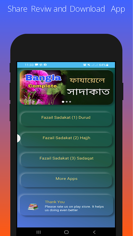 সম্মানিত পাঠক/পাঠিকা ভাই ও বোনেরা, এই App টিতে ফাযায়েলে ছাদাকাত সম্পুর্ন এক সাথে আনা হয়েছে। পরিস্কার ও ঝক ঝকে FDF ফাইল, এবং জুম করে পড়ার সুবাधাাधসুবাधা আশা করে সবাই উপকৃত হবেন ইনশা আল্লাহ ৷ R সেই সাথে App টি ভাল লাগলে একটি রিভিউ দিয়ে ও প্রিয়জনদের সাথে শেয়ার করে, দ্বীনিকাজে সহযোগিতা করার অনুরুদ রইল ৷