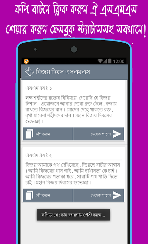 এ ছাড়াও রয়েছে " কপি " অপশন। যেখানে ক্লিক করলে মেসেজ কপি হয়ে যাবে। যা আপনি যেকোন জায়গায় পেস্ট করতে পারবেন। ফেসবুকে স্ট্যাটাস দিতে পারবেন। ভাইবার কিংবা হোয়াটসঅ্যাপের মাধ্যমেও পাঠিয়ে দিতে পারবেন প্রিয় জনকে।