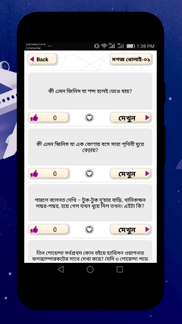 আর এই এপস এ আর ও পাবেন মজার রাতের ধাঁধা, বিয়ে করা বউ কে নিয়ে গোপন ধাঁধা । আমাদের মধ্যে এমন কোন মানুষকে খুঁজে পাওয়া যাবে না যে বিনোদনের আসর ও মজার ধাঁধা পছন্দ করে না। আমাদের এখানে আমরা সাড়াজাগানো সকল বাংলা ধাঁধা নিয়ে এই অ্যাপ টি করেছি যেখানে সুধু বিনোদনই নয় বরং আপনার জ্ঞান পরিধিকে বারিয়ে তুলবে।