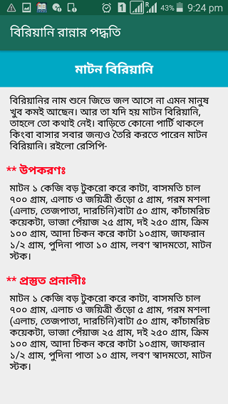 এই অ্যাপ্লিকেশন এ পাবেন সব ধরনের বিরিয়ানি রান্নার সহজ পদ্ধতি ।যার মাধ্যমে খুব সহজেই ঘরে বসে রান্না করতে পারবেন সুস্বাদু বিরিয়ানি।