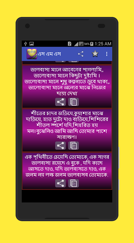 ভালোবাসার মানুষ কে খুশি রাখতে প্রয়োজন হয় কবিতা অথবা এসএমএস আর এই এস এম এস সবাই সাজিয়ে লিখতেও পারেন না। তাহলে কি করবেন? চিন্তা নেই আমরা আপনাদের জন্য নিয়ে এলাম ভালবাসার এস এম এস আপনি শুধু পড়বেন আর যেটা পছন্দ সেটা ক্লিক করে পাঠিয়ে দিবেন আপনার প্রিয় মানুষ কে। এর জন্য আমরা ভালোবাসার মেসেজ অ্যাপ টি তে রেখেছি sms কপি ও সরাসরি সেন্ড করার অপশেন।