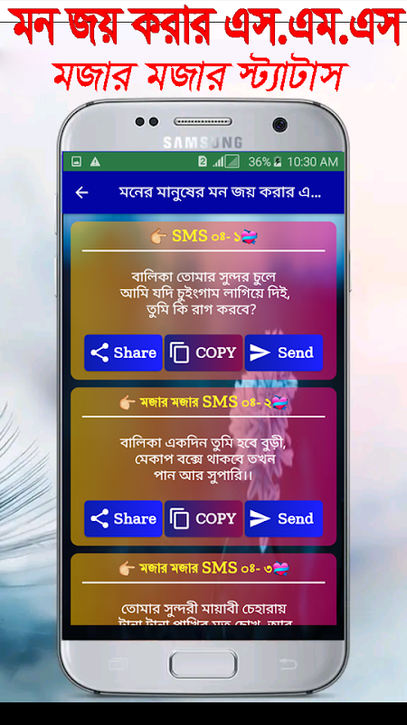 আমাদের অ্যাপের মধ্যে আপনি "ভালোবাসার মানুষের মন জয় করার SMS"সকল এসএমএস খুব সহজেই পেয়ে যাবেন। প্রতিটি এস এম এস "COPY"করে খুব সহজেই আপনি আপনার মনের মানুষকে পাঠাতে পারবেন।শুধু আপনাদের সুবিদার্থে আমার অক্লান্ত পরিশ্রমের ফলশ্রুতিতে এই অ্যাপটি বানানো।