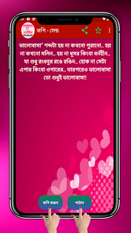 → Love SMS Bangla অ্যাপটি আপনার ভালো লাগলে অবশ্যই আপনার মূল্যবান কমেন্টস ও রেটিং দিয়ে আমাদের আরো নতুন নতুন Bangla Message এড করতে উতসাহিত করবেন। ধন্যবাদ।