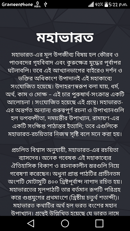 মহাভারত অতি বৃহৎ গ্রন্থ। সংস্কৃত ভাষায় এতাদৃশবিস্তীর্ণ গ্রন্থ আর দেখিতে পাওয়া যায় না। ইহা ইতিহাস বলিয়াই প্রসিদ্ধ; কিন্তু কোন কোন স্থলে ইহা পুরাণ এবং পঞ্চম বেদ শব্দেও উক্ত হইয়াছে। বস্তুতঃ মহাভারতে পুরাণের সমস্ত লক্ষণ বিদ্যমান আছে, এবং স্থানে স্থানে বেদের আখ্যানও বর্ণিত হইয়াছে। ইহাতে দেবচরিত, ঋষিচরিত ও রাজচরিত কীর্ত্তিত হইয়াছে এবং নানাপ্রকার উপাখ্যানাদিও লিখিত আছে। অতি বিস্তৃত মহাভারত গ্রন্থে অনেক প্রকার রাজনীতি ও ধর্ম্মনীতি উক্ত হইয়াছে, এবং নানাবিধ লৌকিকাচার ও বিষয়-ব্যবহারও বর্ণিত আছে।
