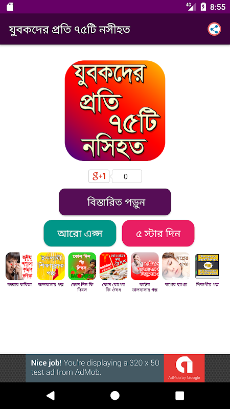 যুবকদের প্রতি ৭৫টি নসিহত এই অ্যাপটি আপনার দৈনন্দিন জীবনের বিভিন্ন পর্যায়ের সাথে সম্পর্কিত । এই নসিহতগুলো মেনে চললে আপনার দিনের প্রায় চব্বিশ ঘন্টাই মহান আল্লাহ তায়ালার ইবাদাত বন্দেগীর মাঝে কাটবে । এই নসিহতগুলোতে আপনি পাবেন প্রাত্যহিক লেনদেন এর ইসলামিক নিয়ম, আদব ও শিষ্টাচারের নিয়ম, আচার ব্যবহার ও চরিত্র বিষয়ক পরামর্শ। এই এ্যাপটিতে যে ৭৫টি নসিহত রাখা হয়েছে, তার প্রতিটিই কোরআন ও হাদিসের আলোকে যাচাইকৃত এবং অভিজ্ঞ ও জ্ঞানী আলেমদের দ্বারা অনুমদিত। আপনি নিজে এই এ্যাপটি ডাউনলোড করুন ও আপনার ভাই-বোন-বন্ধুদের এর উপদেশবানীগুলো দ্বারা উদ্বুদ্ধ করুন। আপনার দুনিয়াবী ও আখেরাতের জীবন কোরআন, হাদিস ও সর্বোপরী ইসলামের আলোকে আলোকিত হোক।