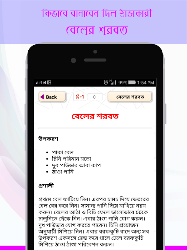 গরমে সারাদিনের ক্লান্তি দূর করতে বা, ঈদ রেসিপি তে এক গ্লাস ঠাণ্ডা শরবত পেলে যেন প্রাণটা জুড়িয়ে যায়। এছাড়াও শরীর চর্চা ও ওজন কমানোর উপায় কিংবা, রুপচর্চা ও গরমে ত্বকের যত্ন নিতেও আজকাল সরবত এর কার্যকারিতা কে না জানে? আর রমজানে তো কথাই নেই, শরবৎ ছাড়া তো ইফতারই জমে না! তাই তো পত্রিকাগুলোর খাবারের রেসিপি বা, রান্নার রেসিপির পাতায় আজকাল আজকাল চোখে পড়ে নানান স্বাদের, নানান রুচির শরবতের রেসিপি। তাই আমাদের এই অ্যাপে আমরা ১২ টি ভিন্ন ভিন্ন স্বাদের শরবতের রেসিপি নিয়ে এসেছি আপনাদের জন্য। নিচের শরবতগুলোর উপকরণ, প্রস্তুতপ্রণালী বিস্তারিত বর্ণ্না এতে আছেঃ-