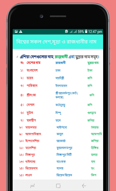 Información de সকল দেশ, রাজধানী ও মূদ্রার নাম APK