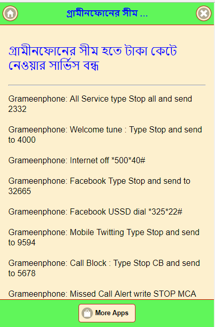 অনেক সময় দেখা যায় মোবাইল ফোন অপারেটর গ্রামীণফোন এর বিভিন্ন নাম্বার থেকে এস এম এস আসে এবং আমাদের মোবাইলের টাকা কেটে. ... আর যদি বন্ধ না হয় তাহলে যে নাম্বার থেকে SMS আসে তার প্রথম দুইটা সংখ্যা বাদ দিলে যে নাম্বার পাওয়া যায় সেই নাম্বারে STOP ALL লিখে পাঠিয়ে দিবেন তাহলে ঐ নম্বার থেকে SMS আসা বন্ধ হয়ে যাবে । তাছাড়া বিভিন্ন সার্ভিস OFF করতে নিচের তথ্যগুলো অনুসরণ করুন !