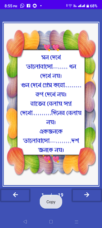 আমাদের এই অ্যাপে সুন্দরী মেয়েদের পটানো রোমান্টিক বাংলা সকল এসএমএস কালেকশন ইন্টারনেট ছাড়াই খুব সহজেই উপভোগ করতে পারবেন এবং প্রিয় মানুষদের কাছে কপি করে বিভিন্ন সোশ্যাল মিডিয়াতে শেয়ার করতে পারবেন।।