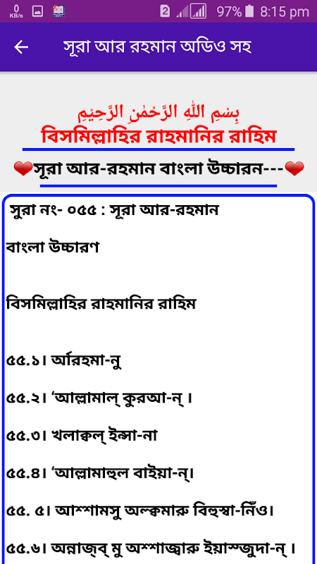 পবিত্র কুরআনের “সূরা আর রহমান অডিও” অ্যাপটি বাংলা অনুবাদ সহ তৈরি করা হয়েছে।